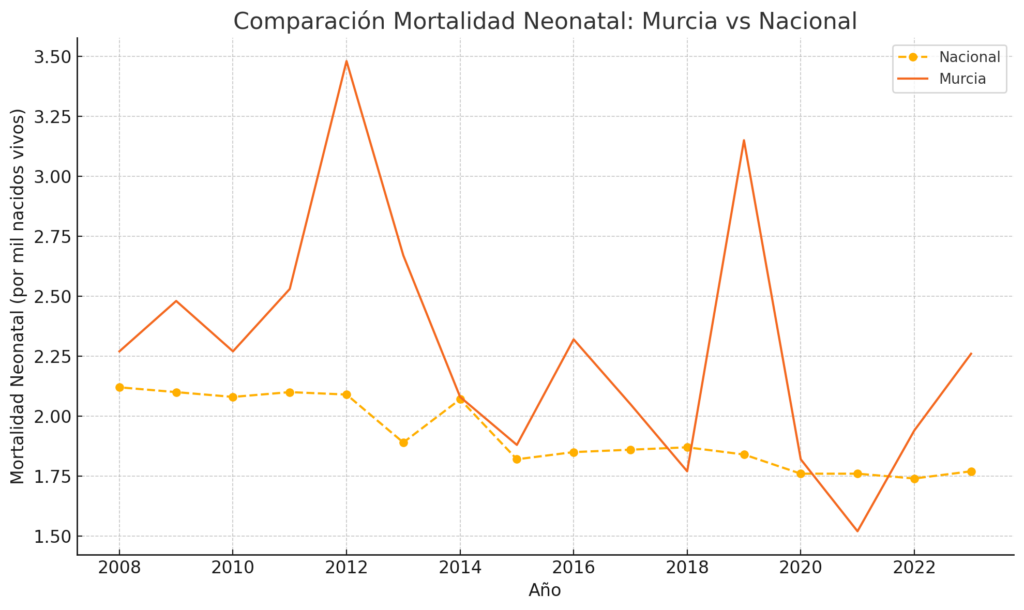 - Murcia presenta valores superiores a la media nacional en varios años.