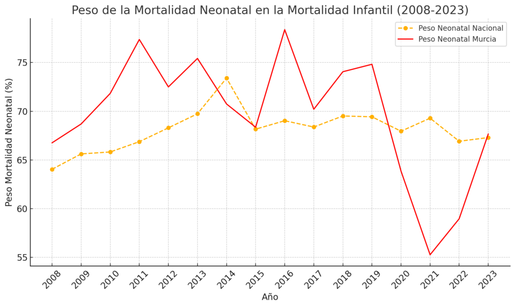 - La mortalidad infantil ha mostrado una tendencia descendente constante desde 2008, con un ligero repunte en 2023 (2.63).