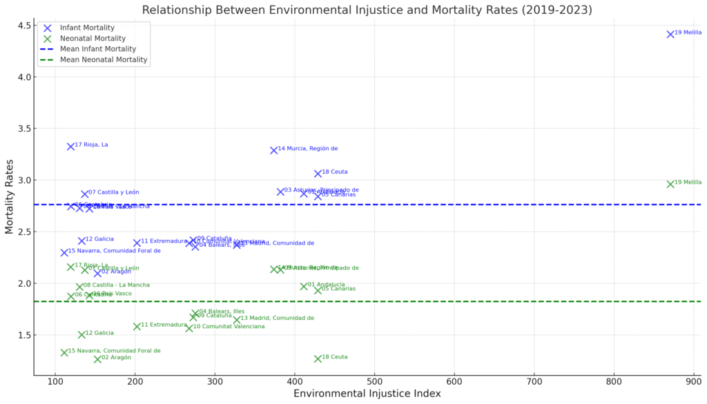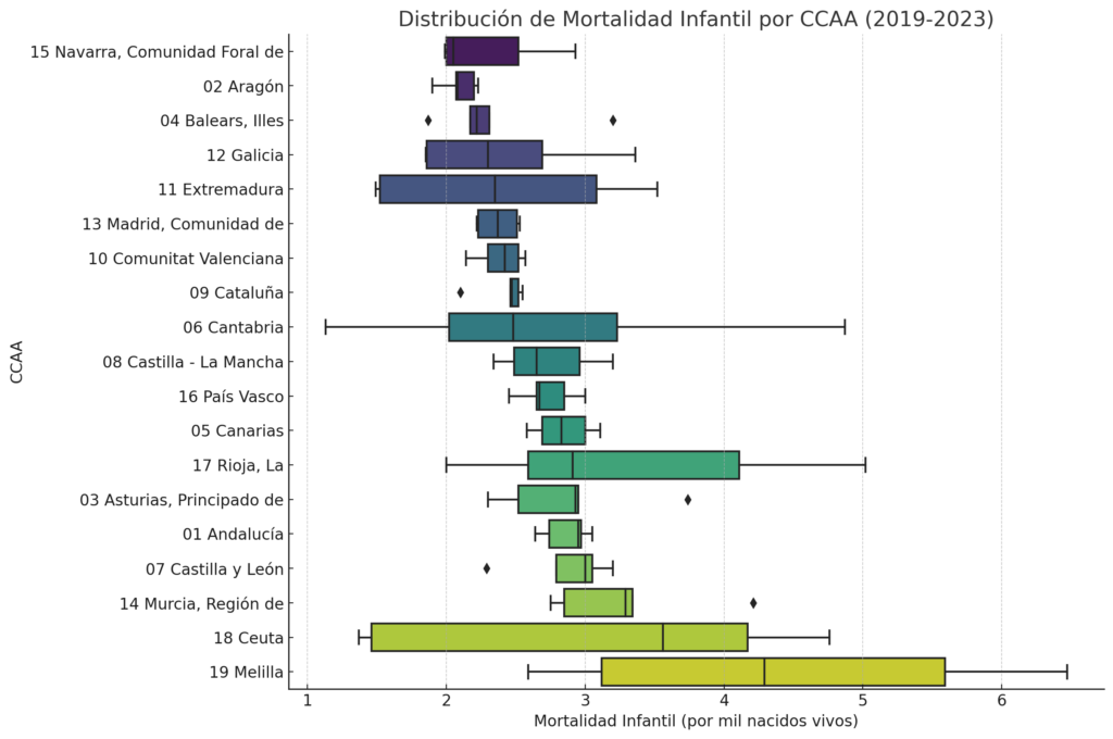 Estos gráficos permiten visualizar las desigualdades regionales en mortalidad infantil y resaltar la variabilidad dentro de las comunidades autónomas.